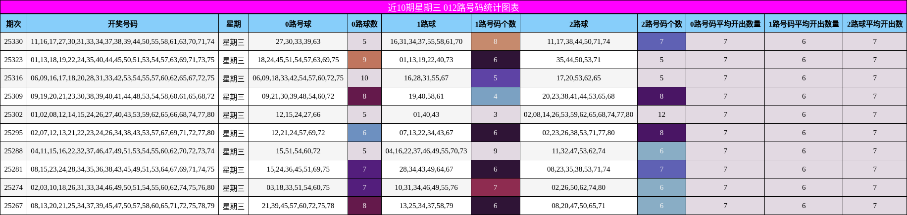 012路分析:三路均衡再现,0路与2路或成双热近10期星期三,0路与2路号码各开出70个,1路60个,三者平均值均为6-7个/期,整体趋于均衡。上期2路号码开出10个,为近10期最高,显示2路有回补趋势。本期预测012路比为6:7:7,意味着0路与2路将维持热度,1路则略显温和。