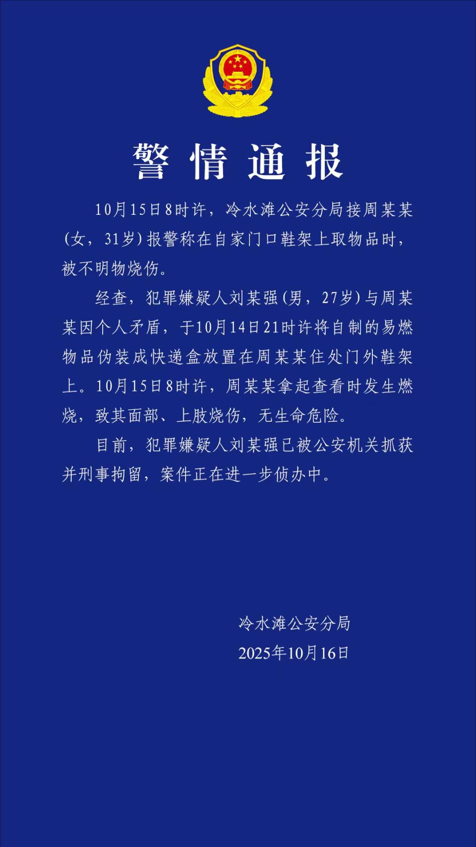 经查,犯罪嫌疑人刘某强(男,27岁)与周某某因个人矛盾,于10月14日21时许将自制的易燃物品伪装成快递盒放置在周某某住处门外鞋架上。10月15日8时许,周某某拿起查看时发生燃烧,致其面部、上肢烧伤,无生命危险。