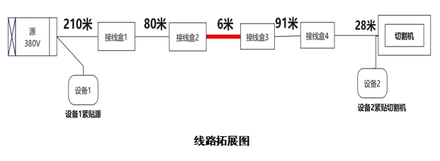 三、测试案例(一)测试线路搭建选取适配380V交联聚乙烯绝缘电力电缆构建测试线路,线路总长度415m,采用首端电源中间接线盒,尾端负载的直线拓扑结构。线路首端连接380V电流源,输出电流范围0~200A,电压波动范围±5%,为线路提供稳定供电。尾端连接一台工业级切割机,额定功率5.5kW,额定电流11A,模拟实际负载工况。线路中间设置4个标准化接线盒,分别位于距首端210m、290m、296m、387m处(见线路图),内部设置接线端子与绝缘密封件,确保连接可靠。线路全程采用实验厂房内桥架敷设方式,沿厂房预设桥架导轨固定,故障定位装置分别安装于线路首端电流源出口处与尾端切割机入口处,装置传感器与电缆导体可靠耦合。线路首端、尾端及4个接线盒处均设置标识桩,精准标注实际距离、设备安装位置及接线盒编号信息。