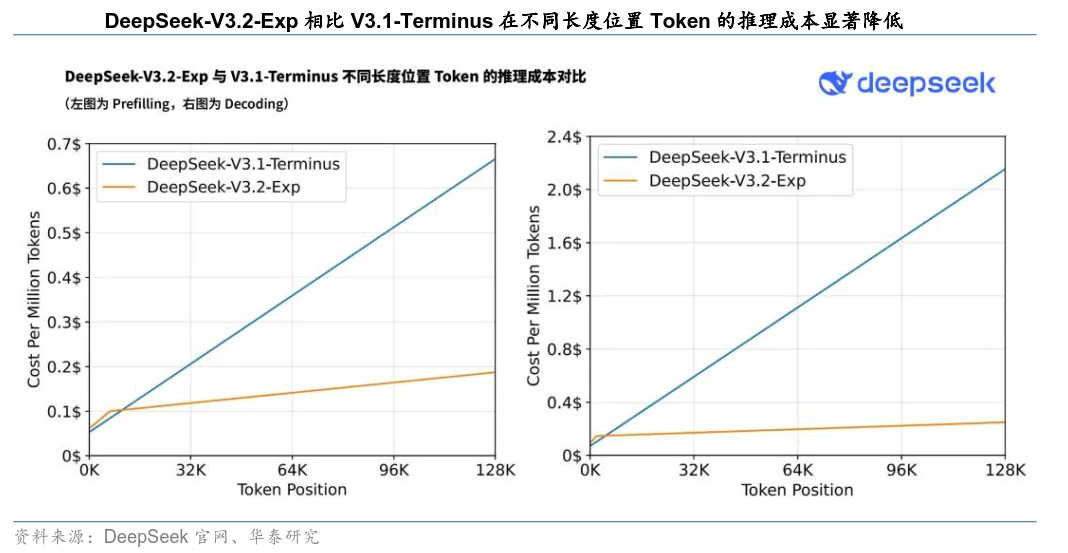 以DeepSeek V3.2为例,DeepSeek V3.2-Exp 在性能上与上一版 V3.1-Terminus 差距不大,并将 V3.2 定位为“迈向新一代架构”的中间步骤。V3.2最大的进步体现在DSA(Dynamic Sparse Attention)的引入,模型训练与推理效率显著提升,相比上一代模型API输入与输出成本分别下降约50%与75%以上(推理成本)。