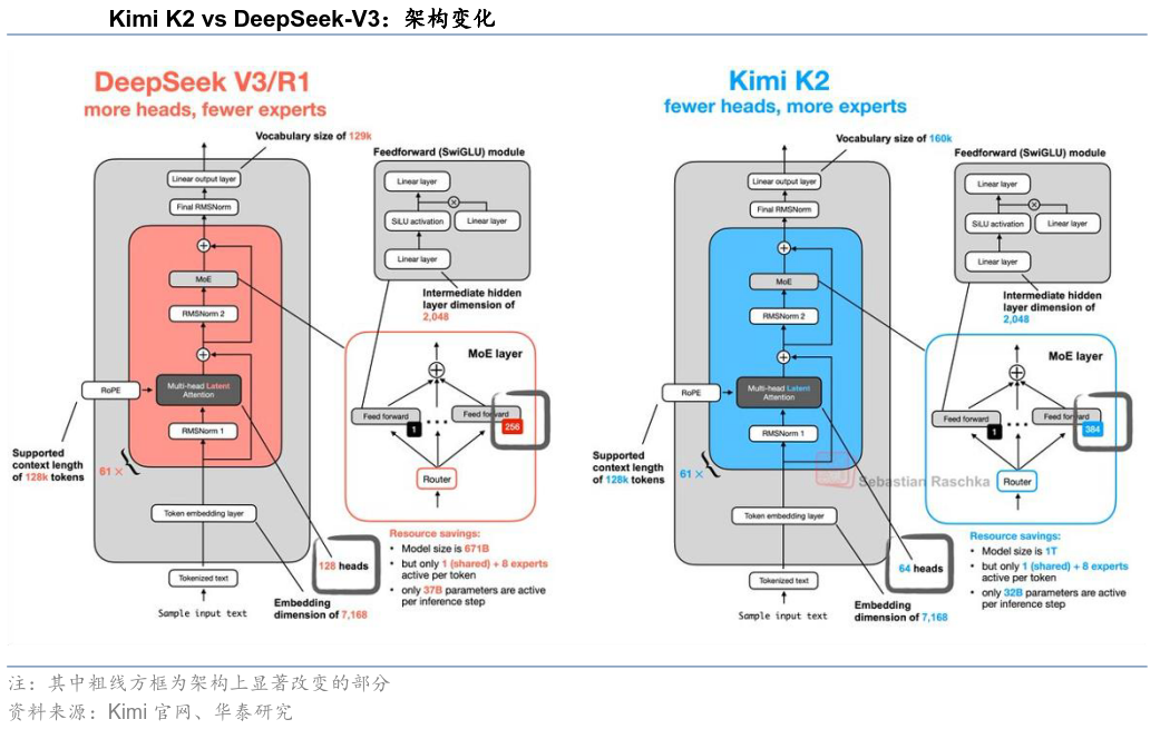 DSV3框架的成功,令很多模型在DeepSeek V3框架引入针对性架构优化,如Kimi K2,K2主要改进包括验证在激活参数不变的条件下,单纯提升MoE总参数量依然符合Scaling规律,训练与验证loss持续下降且无过拟合迹象;适度减少Attentionhead数量,在保持性能稳定的同时显著降低算力开销;仅保留首层dense层,其余全部采用MoE结构,以改善首层router负载不均并提升专家利用效率;引入无分组的简化router,优化计算路径与参数调度;将模型参数从V3的671B提升到1T;引入MuonClip优化器,显著提升训练稳定性与收敛一致性。