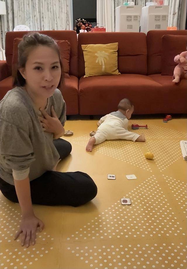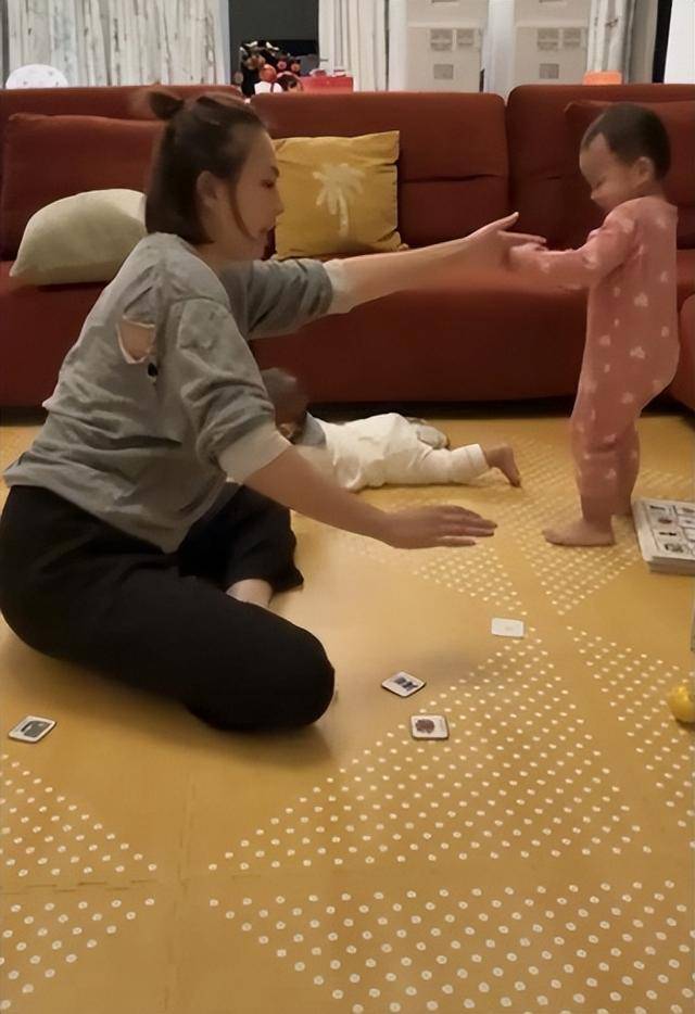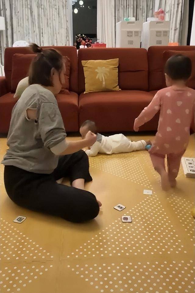 朱慧敏两岁的女儿穿着红色的套装,小家伙明显长高不少,发量也是越来越密集,而不到一岁的儿子则是在地上爬来爬去,小家伙很顽皮,导致朱慧敏有些慌乱。