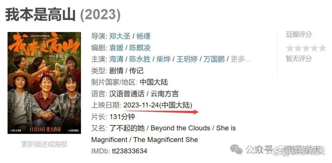 去年全网痛批的《我本是高山》,上映一年豆瓣仍未开分,上映日期11.24(周五)
