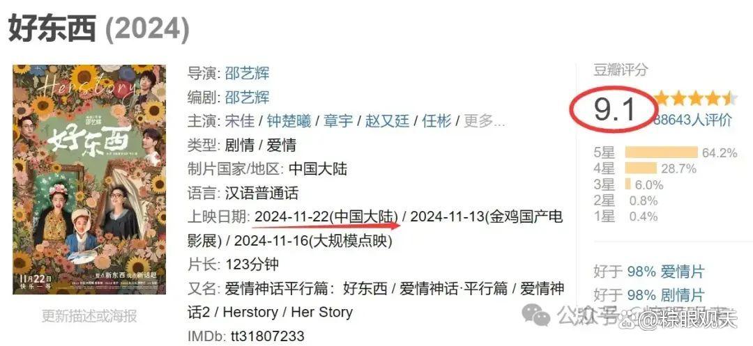 11.22日(周五)才正式上映,豆瓣已开分9.1,将近9万人评价,今年国产片评分最高。