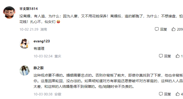 还有网友认为:没离婚,有人追,为什么?因为人妻,又不用花太多的钱!离婚后,追的都跑了,为什么?不想接盘,怕花钱!扎心不,仙女们?