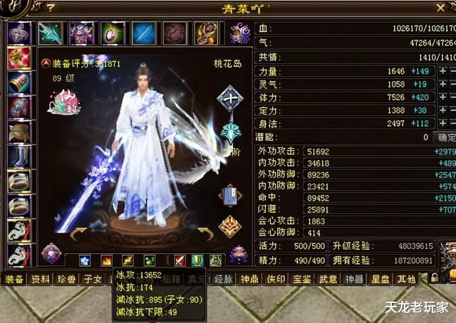 评分35万,血量102万,蓝量4.7万,命中8.9万,闪避2.5万,会心攻击1863,会心防御414,主冰攻击13652!