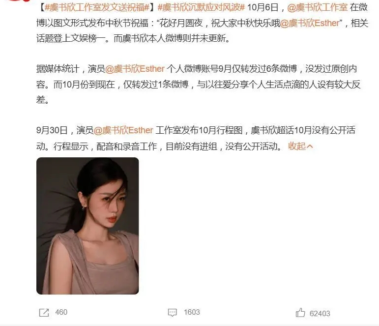 面对双重争议,虞书欣选择保持沉默。她的社交账号从8月起大幅减少原创内容,9月仅转发6条微博,10月仅有一次互动。工作室代发的中秋祝福虽登上热搜,评论区却被"要求回应"的呼声淹没。