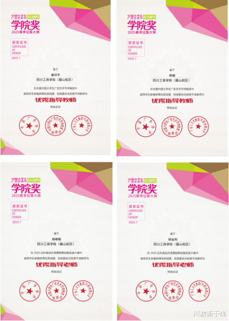 由中国广告协会主办的“中国大学生广告艺术节学院奖2025春季征集大赛”已于近日圆满结束。四川工商学院广告学专业学生凭借扎实的专业素养与创新性创意表现,从全国千余所高校的20万余件参赛作品中脱颖而出,共获41个奖项,其中入围奖32项、优秀奖9项。