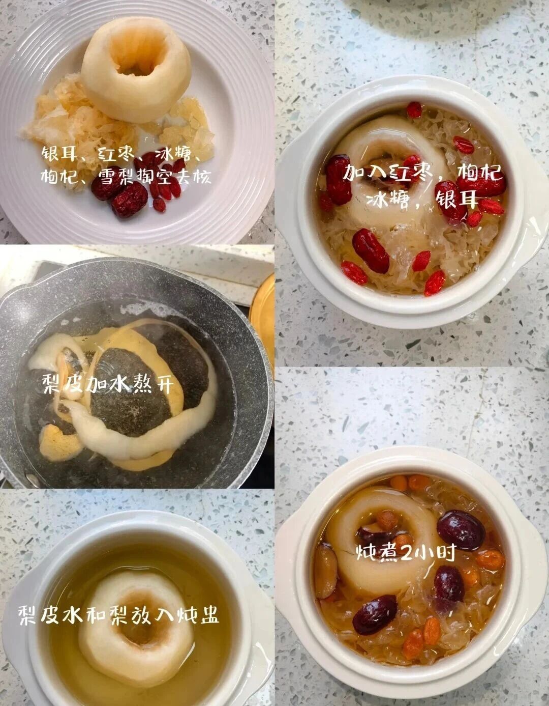 1. 雪梨掏空去核,梨皮加清水熬煮出味后滤出梨皮水。
