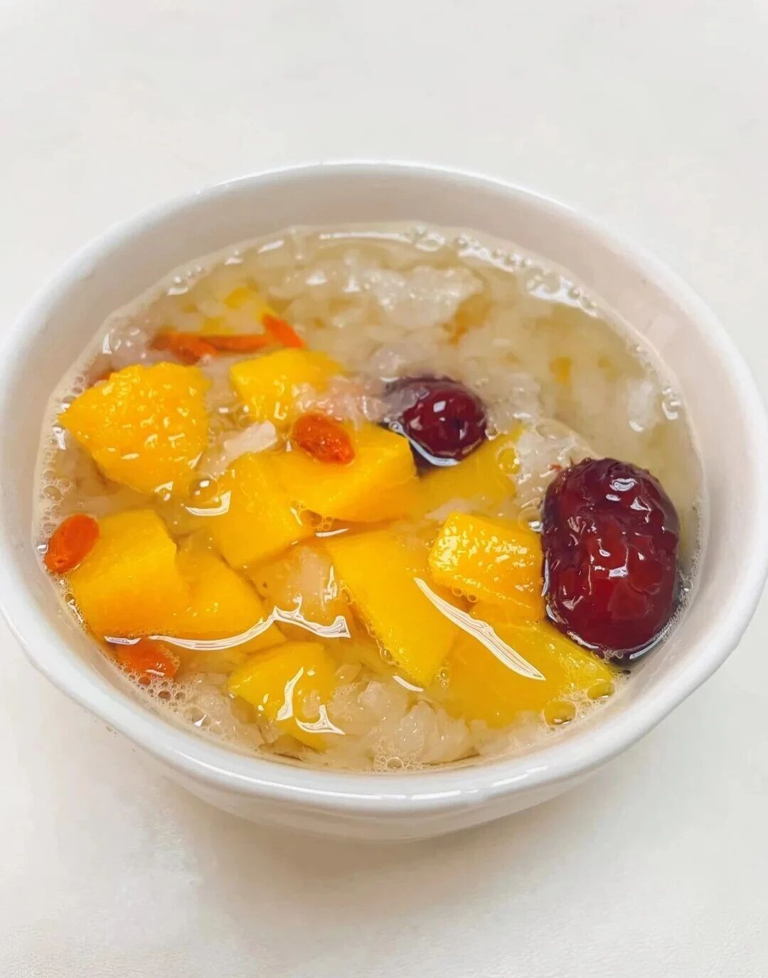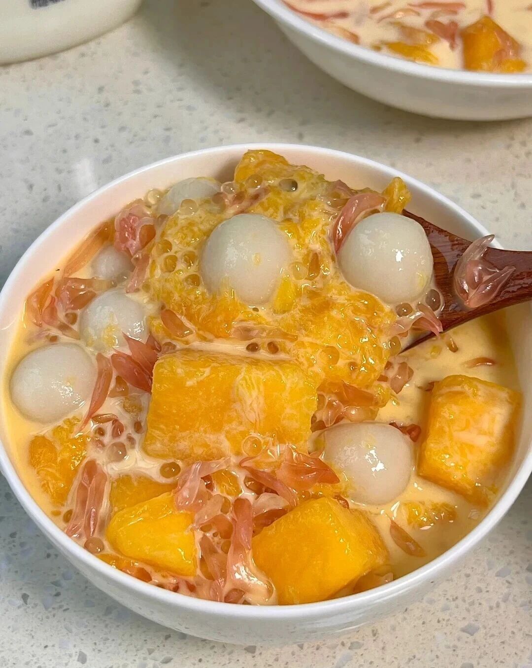 3. 放入西米、剩余芒果丁和柚子肉,倒入冰镇鲜牛奶即可。