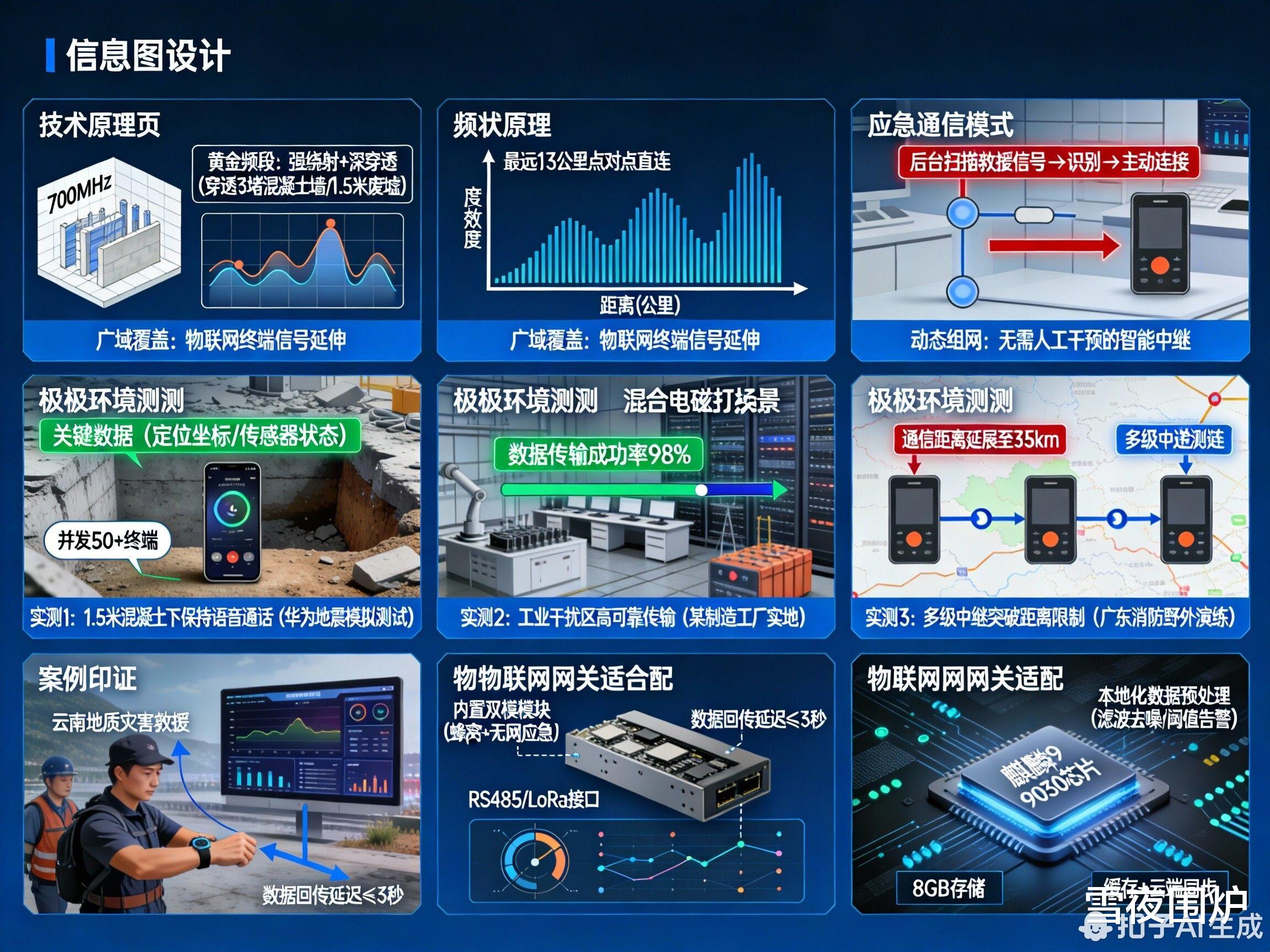 硬件集成设计内置双模通信模块(蜂窝网络+无网应急),断网时自动切换至700MHz中继模式,无缝衔接物联网终端7。扩展接口支持RS485/LoRa等工业协议转换,可直接接入传感器网络。