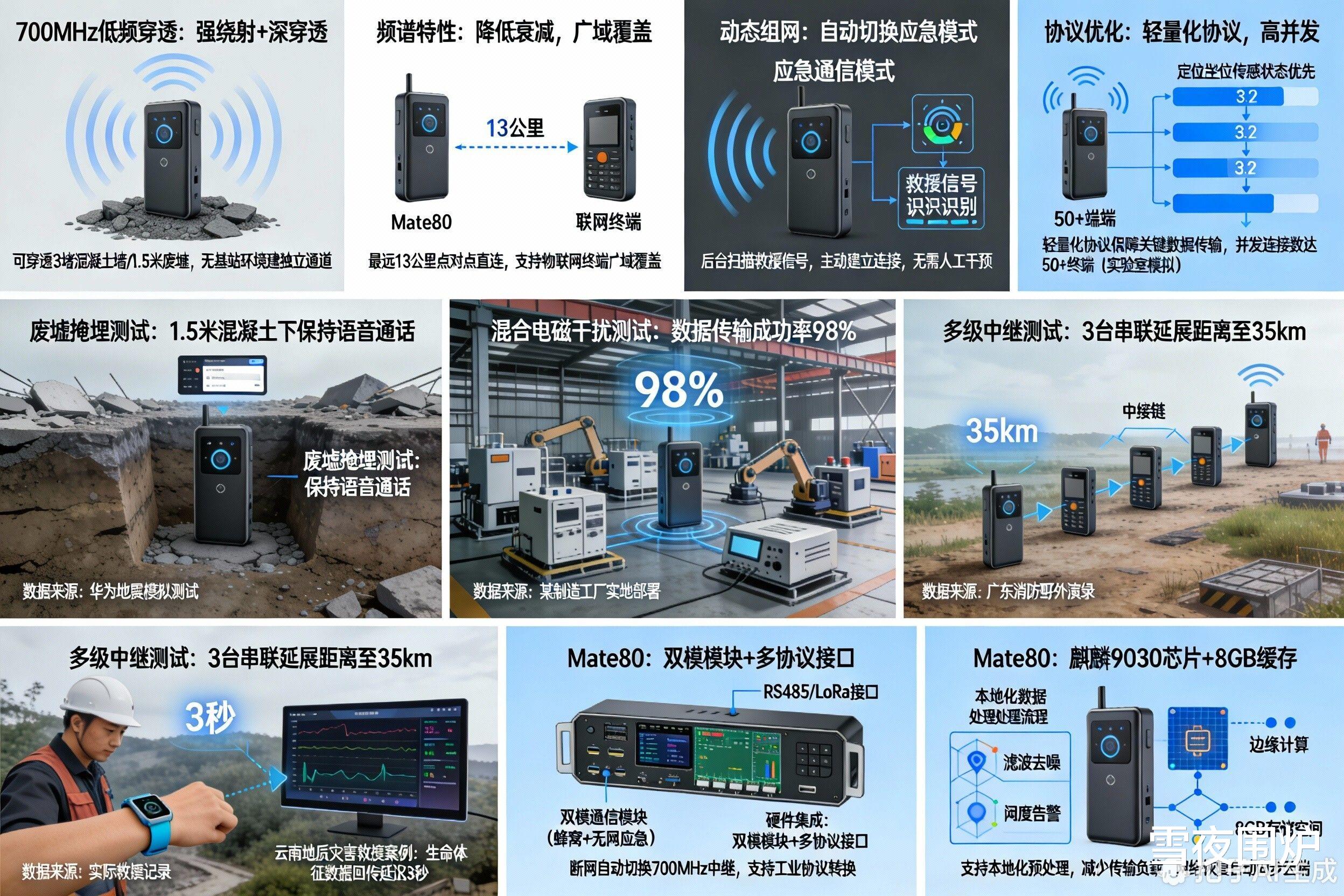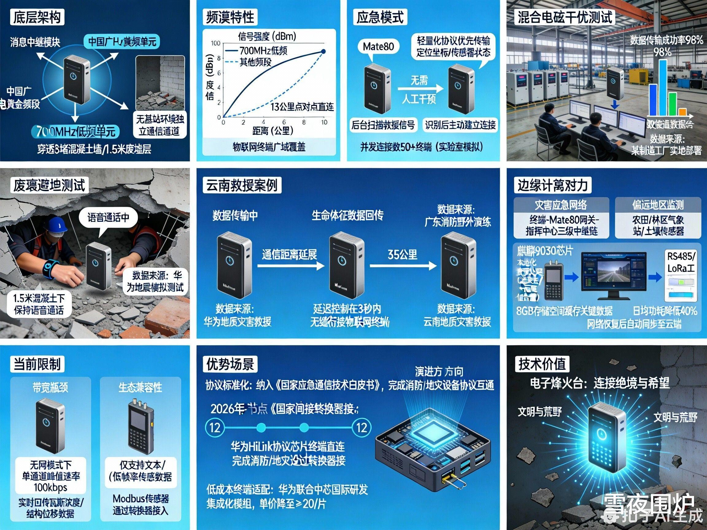 灾害应急网络快速构建“终端–Mate80网关–指挥中心”三级中继链,实时回传坍塌建筑内传感器数据(如瓦斯浓度、结构位移)。