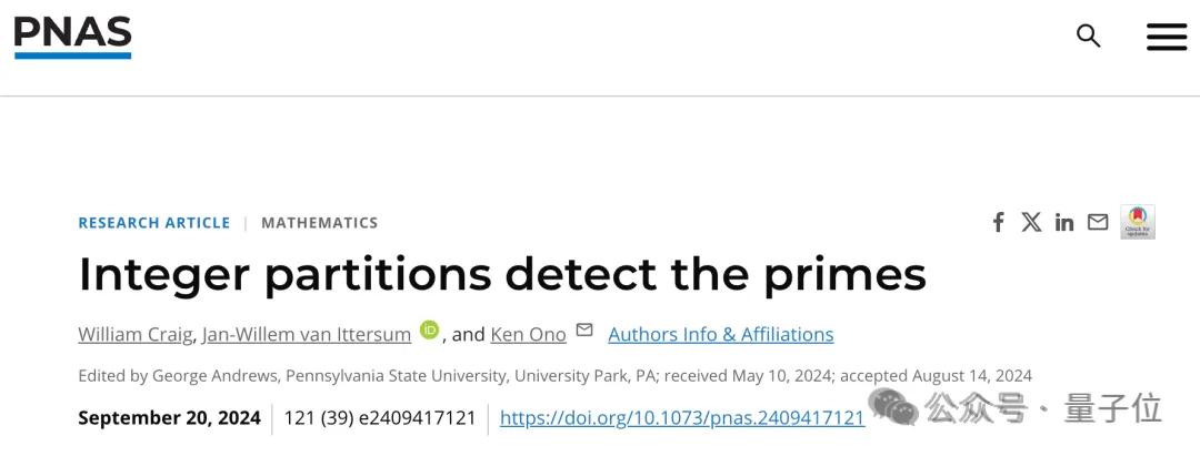 2024年9月,他还在PNAS(美国国家科学院院刊)上合作发表了一篇关于罗杰斯-拉马努金恒等式的应用论文,并将其用于检测质数。