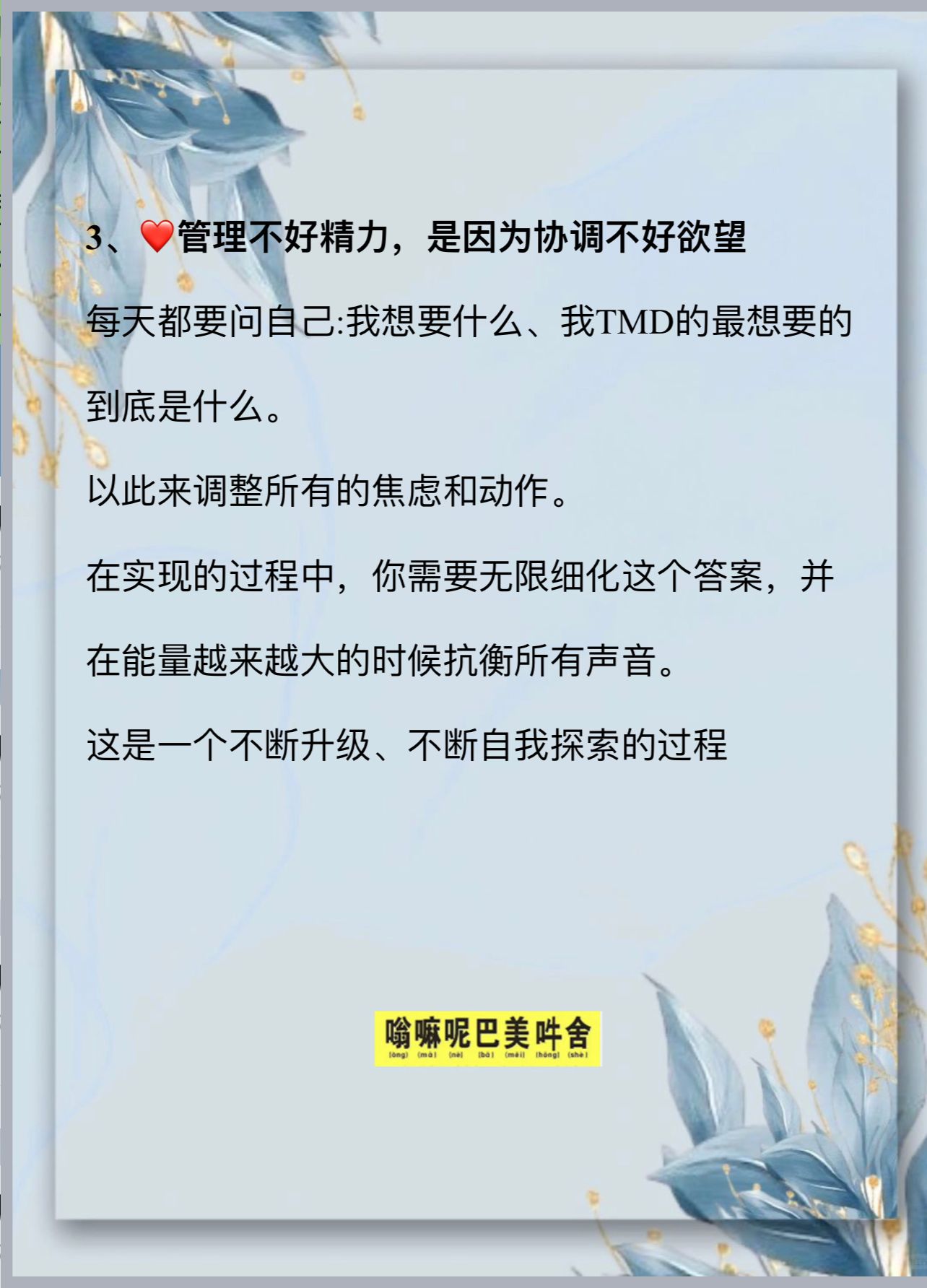 每天都要问自己:我想要什么、我最想要的到底是什么。以此来调整所有的焦虑和动作。在实现的过程中,你需要无限细化这个答案,并