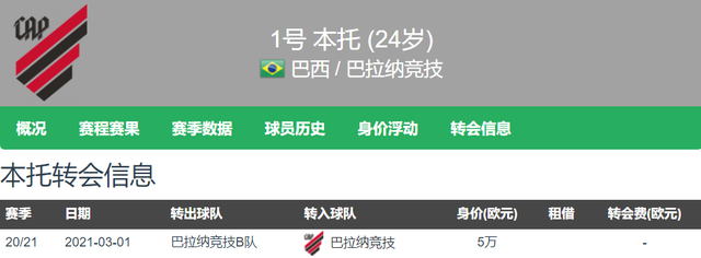 本托现年24岁,身高1.90米,右脚球员,与巴拉纳竞技的合同至2026年,目前球员在德转的身价为1300万欧元。