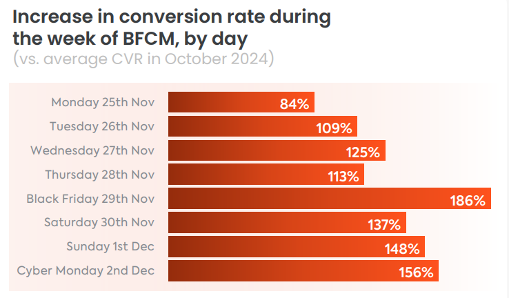 与 2024 年 10 月的平均转化率相比黑五网一当周转化率增长情况(图片来源:Globale)