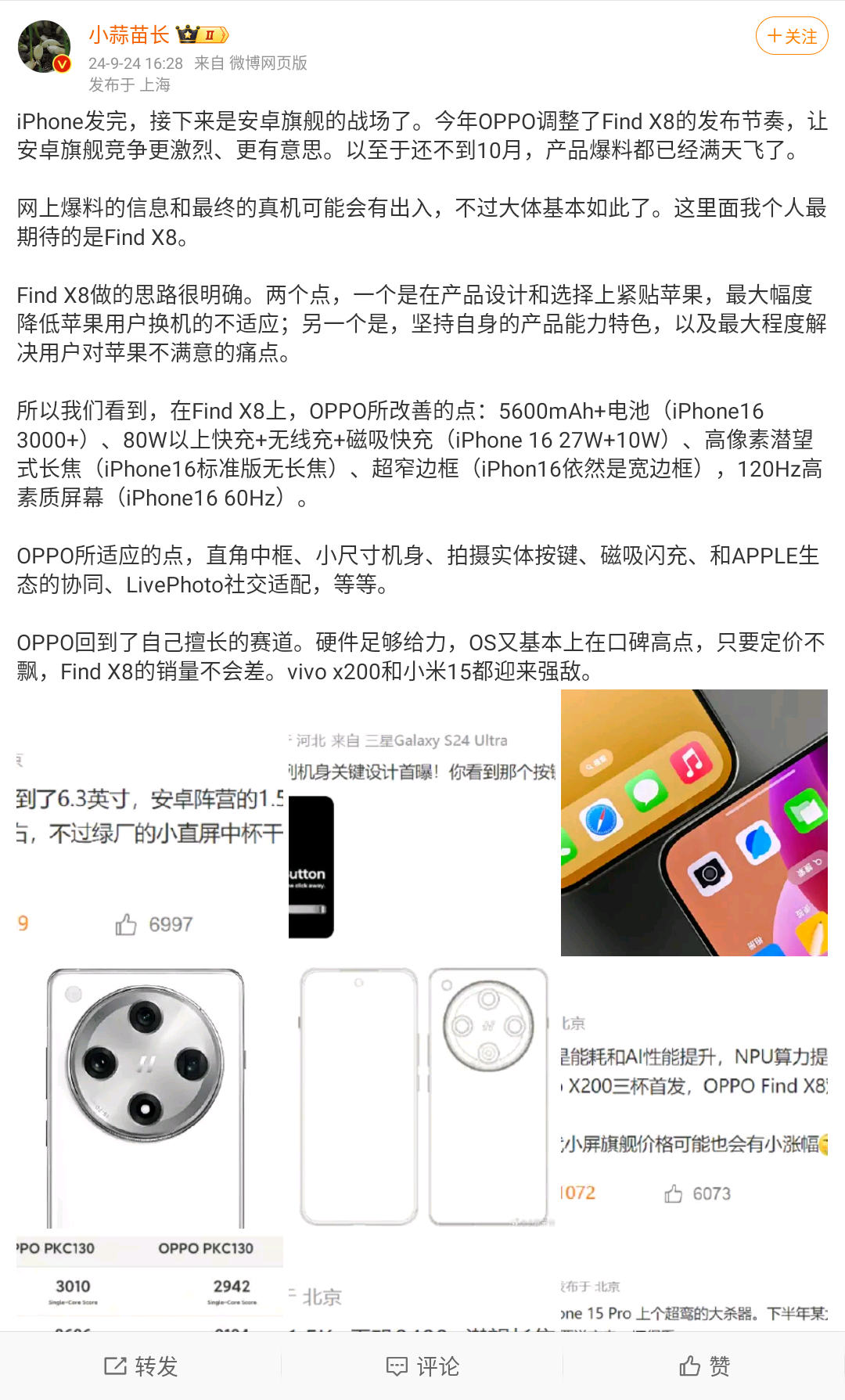 讲真,Find X8是今年最期待的旗舰之一,主要是绿厂给的太多了。Find X8这次明显是奔着iPhone 16去的,从产品设计以及产品能力特色都是如此,从直角中框、小尺寸机身、拍摄实体按键能看出来。目前曝光的配置比iPhone 16有诚意很多。大电池、高功率快充、潜望长焦、超窄边框、磁吸生态等,再加上全新ColorOS 15,你们说能吸引到多少果粉?