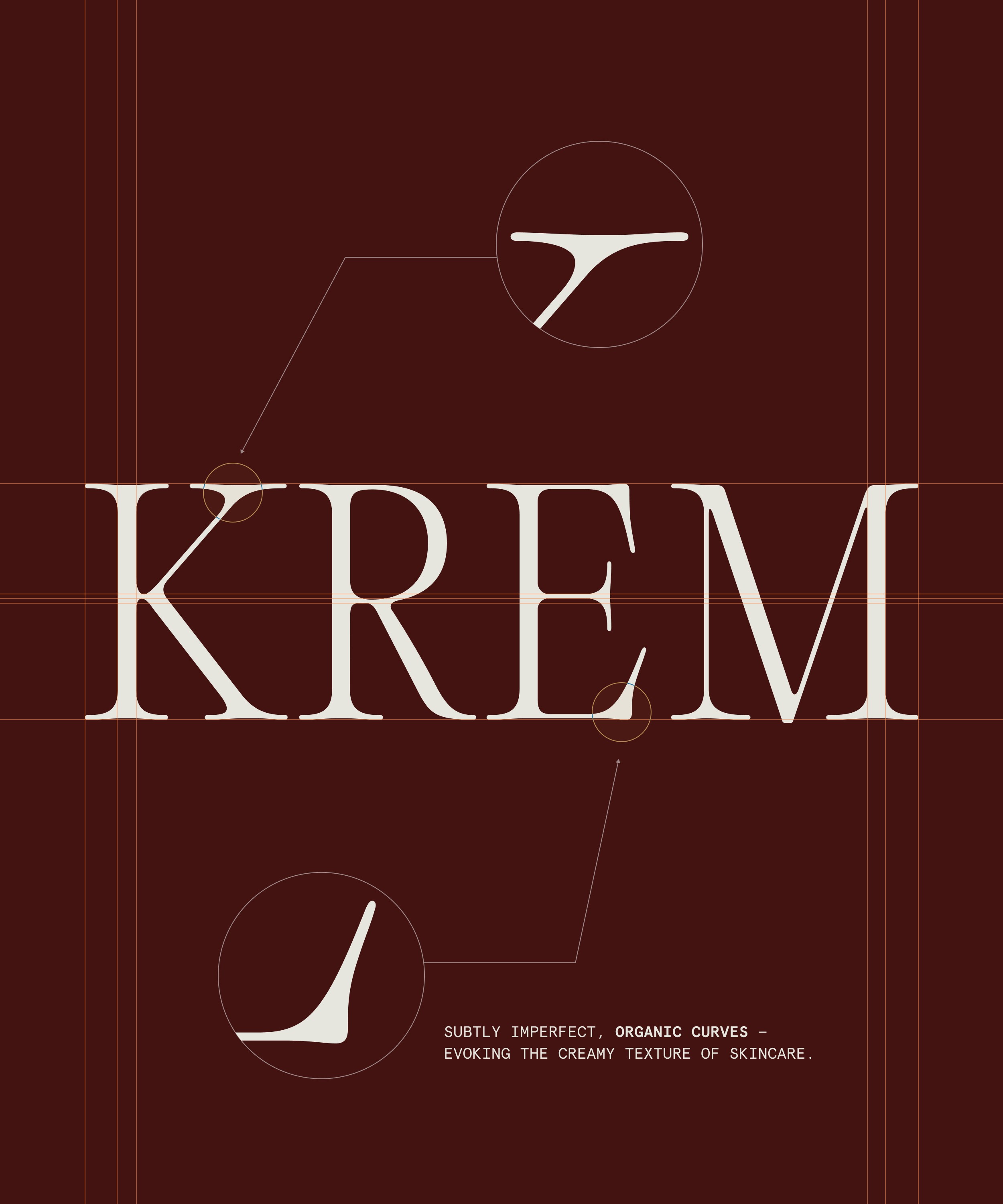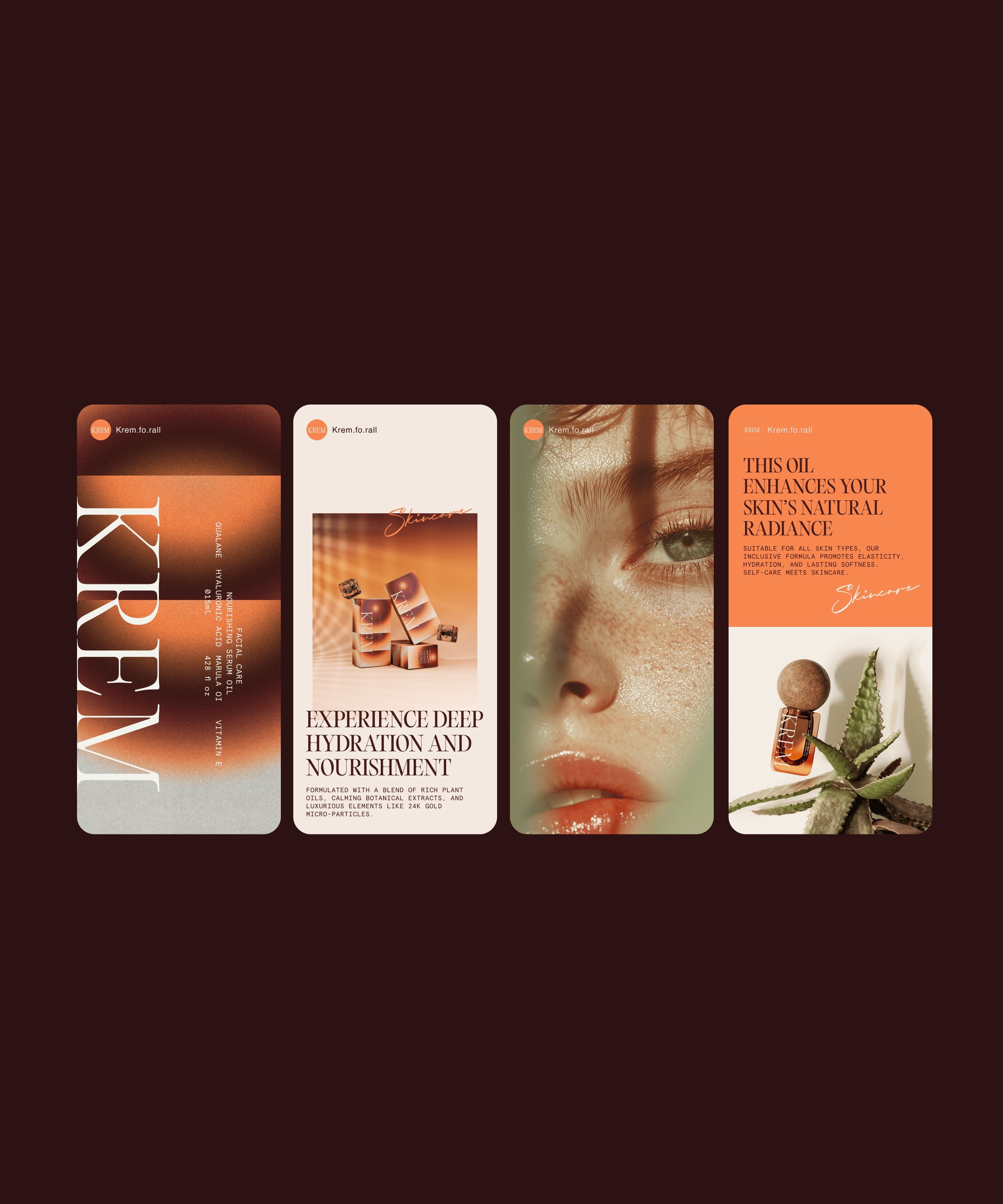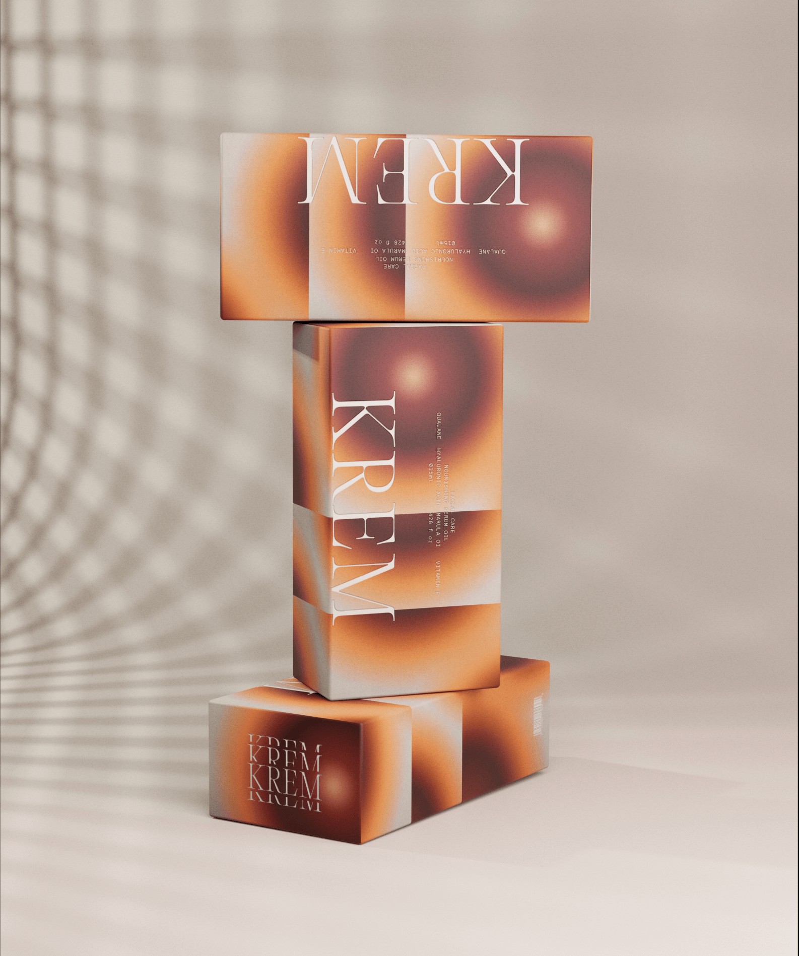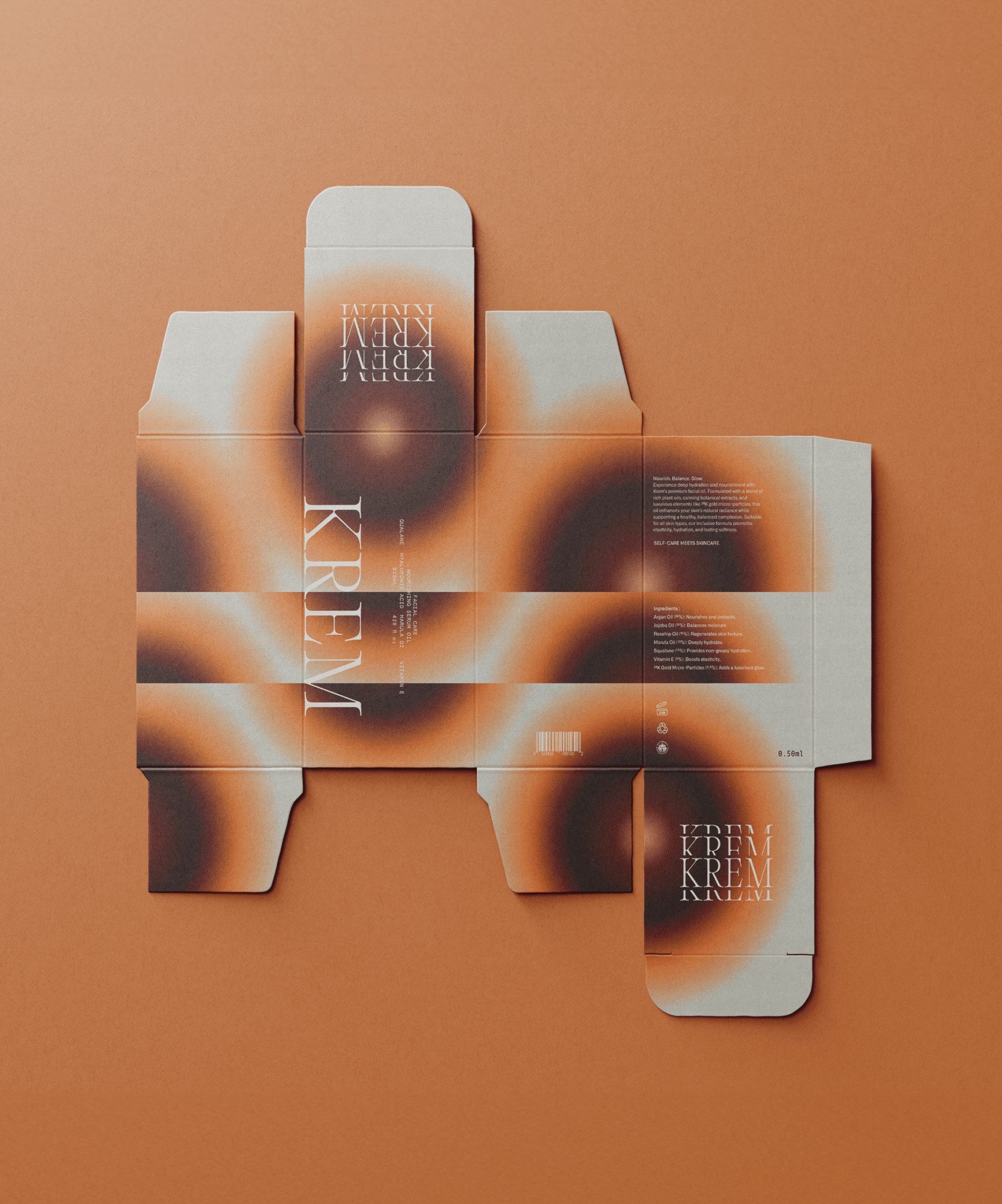 KREM 的视觉形象优雅且包容,采用的字体能够让人联想到护肤品的乳霜质地。搭配温暖的径向渐变,为品牌赋予感官上的柔和感,同时代表了不同肤质与肤色的多样性。其设计细节注重视觉叙事,利用光影和材质,让包装在接触肌肤之前便焕发出独特魅力。整体包装设计不仅对物品起到了保护和展示作用,还提升了用户体验,使 KREM 成为高端且包容的护肤之选。