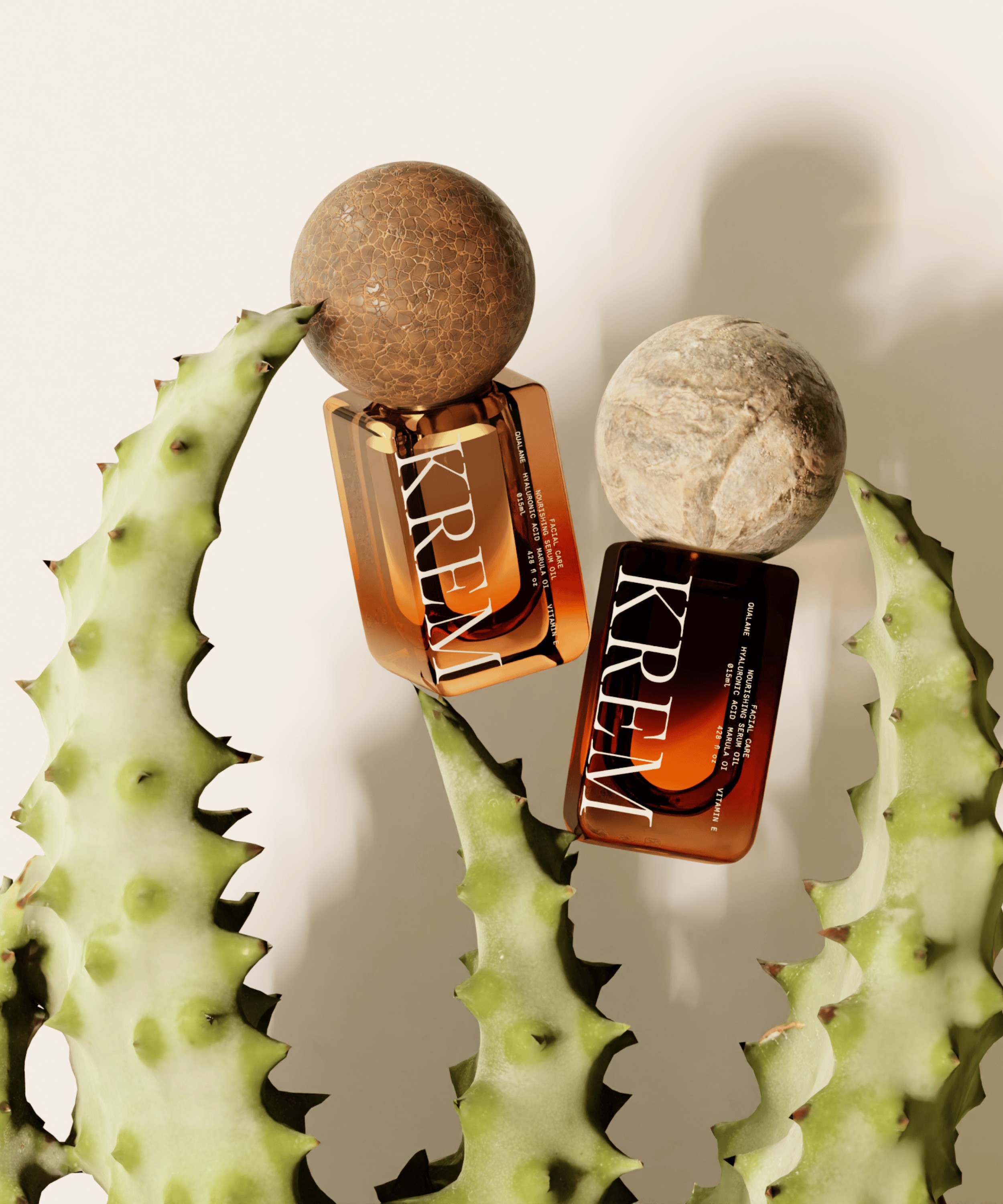 KREM 护肤品牌的包装设计将自然元素与美学魅力完美融合。其瓶身采用雕塑般的设计造型,顶部配有独特的矿物球体,充分体现了内部成分的自然精髓。通过3D设计,确保了对每一处反光和光影效果的精心雕琢,提升了整体的视觉体验。