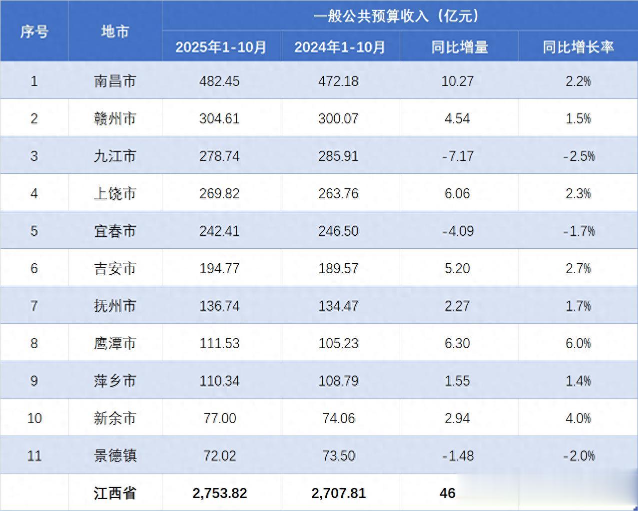 根据统计部门公布的数据,2025年1-10月份,江西全省共实现一般公共预算收入(下称“地方财政收入”)2753.82亿元,较上年同期增长46.01亿元,同比增长率为1.7%,继续保持稳健增长的势头。