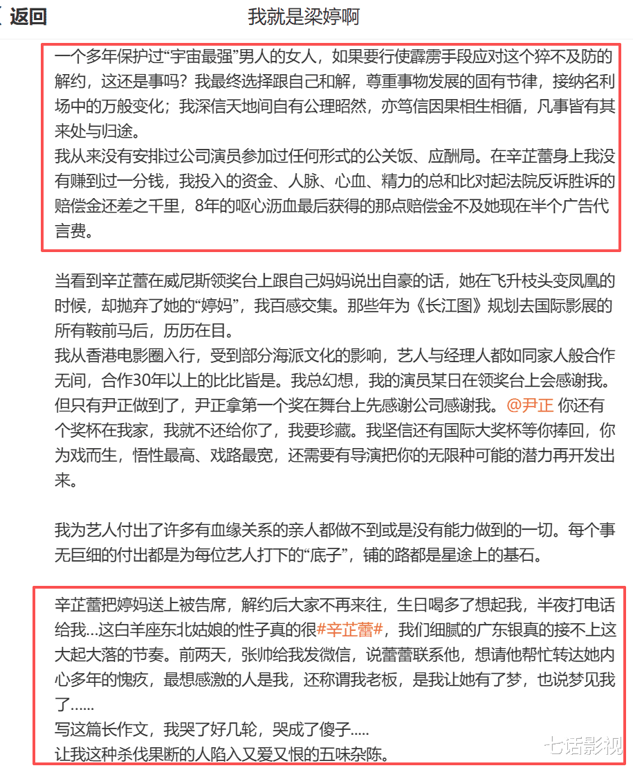 在辛芷蕾的长文中,也提到她称呼梁婷为“婷妈”,当时两人关系可见一斑,梁婷在培养艺人这方面,有点于正推崇的“家文化”味道。