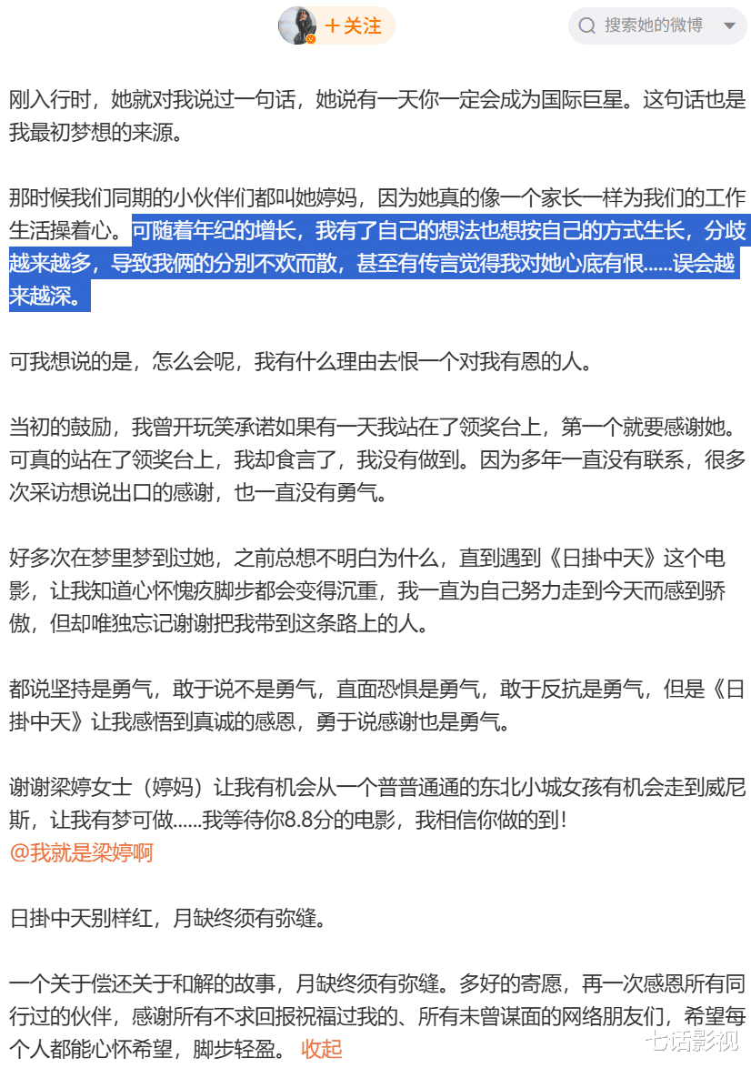 辛芷蕾在和解长文中提到双方分道扬镳的原因是她长大了,想按自己的方式成长,所以分歧越来越多,最终不欢而散,对曾经的矛盾概括的很体面。