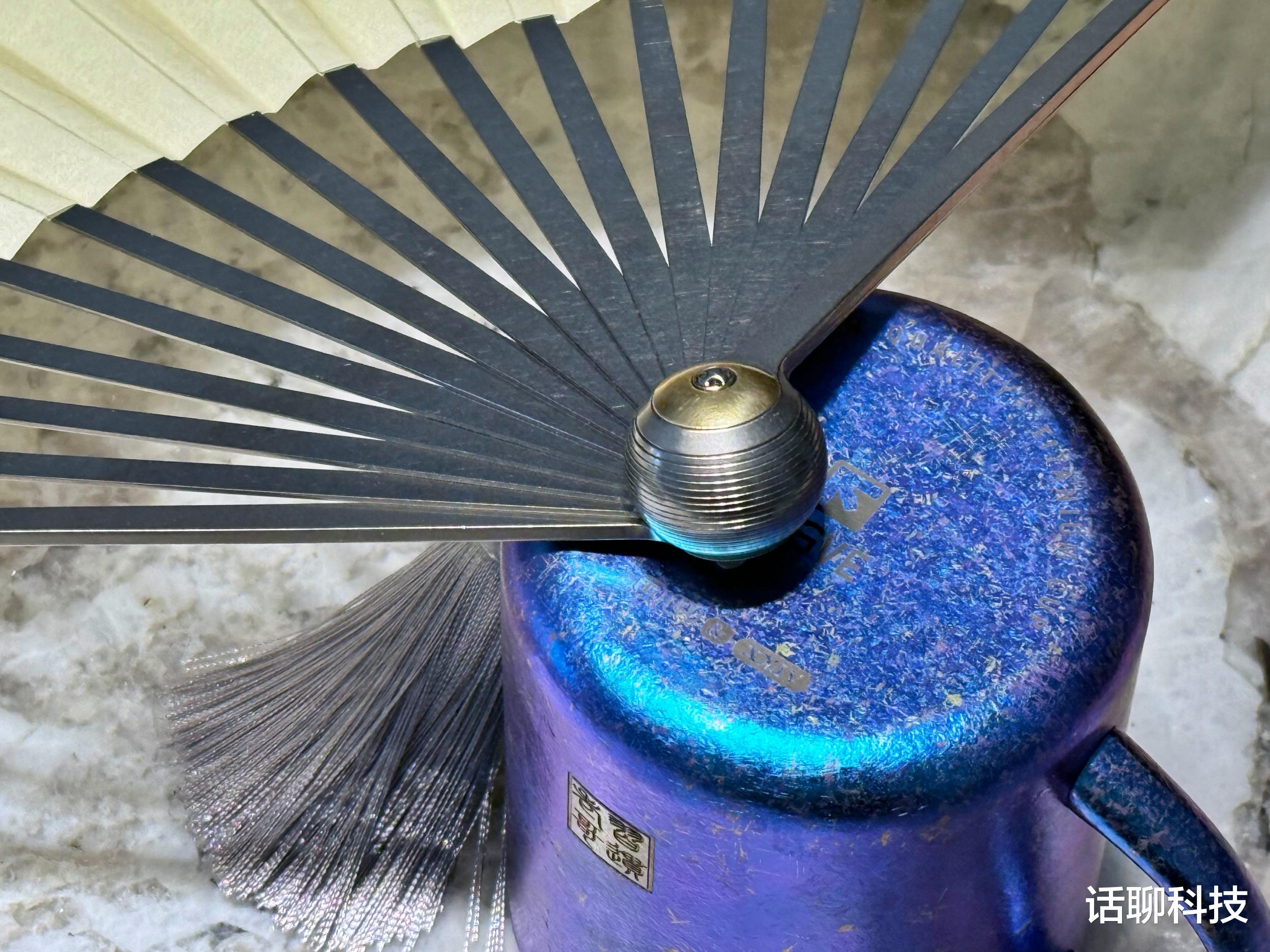 这款扇骨本身是钛合金原色,也就是比不锈钢还略微显灰色,与苹果iPhone 16 Pro Max边框一样。但对于有DIY能力的人,后期也可以对其进行烤蓝处理,用常用的便携式喷枪就能烤出自然氧化的五颜六色,当然最稳定和好看的就是下图出现的钛合金杯子的烤蓝色。