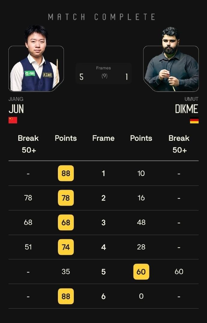说到本轮比赛的亮点,江俊的表现绝对值得大书特书。面对乌姆特,这位中国选手展现出了超强的控场能力。比赛一开始,江俊就在第一局打出88-10的高分,为整场比赛奠定了基调。随后的第二局,他更是轰出单杆78分的精彩表现,第三局又贡献了单杆68分,第四局更是凭借单杆51分以74-18的比分再下一城。虽然第五局未能延续强势,但在第六局中,江俊以88-0的完美比分锁定胜局,最终以5-1的比分轻松晋级。