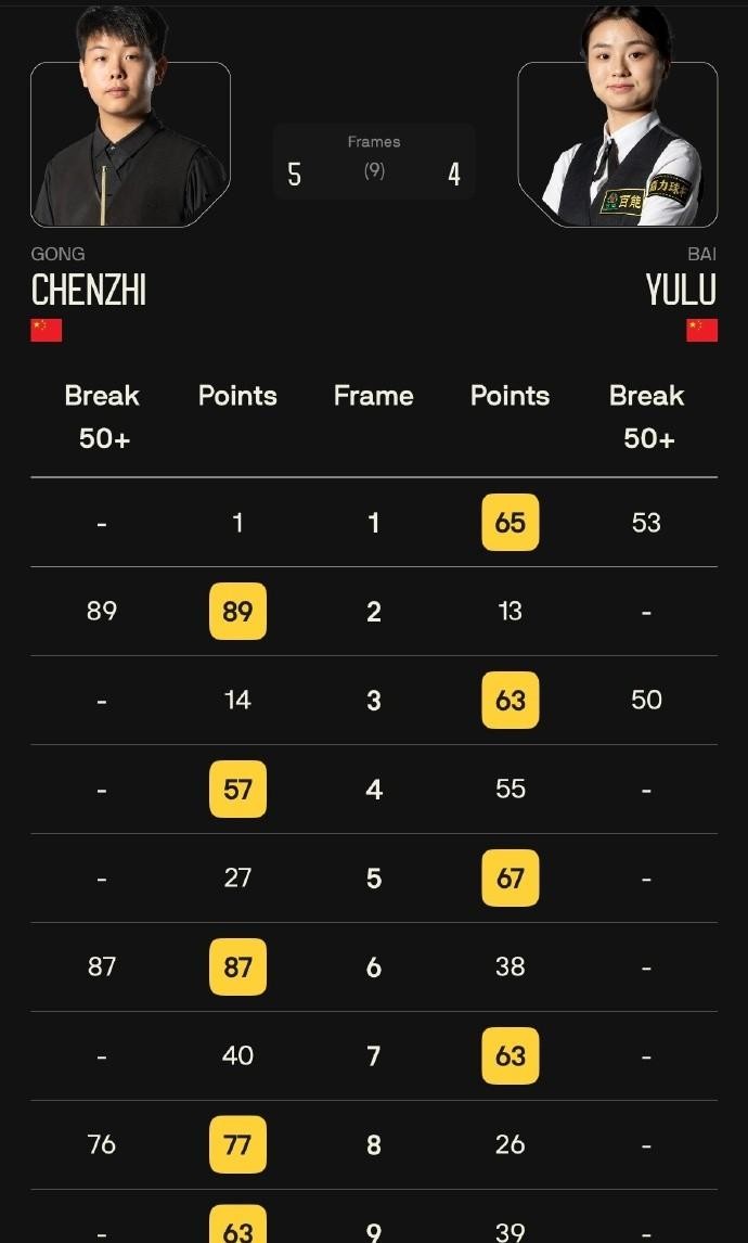 女将白雨露的内战则让人扼腕叹息。面对同胞巩晨智,白雨露虽然在第一局就打出单杆53分,第三局更是贡献了单杆50分的精彩表现,但巩晨智的单杆得分能力确实比白雨露强了不少。巩晨智在第二局轰出单杆89分,第六局贡献单杆87分,第八局又打出单杆76分,最终以5-4的比分险胜,白雨露只能接受4-5惜败的结果。