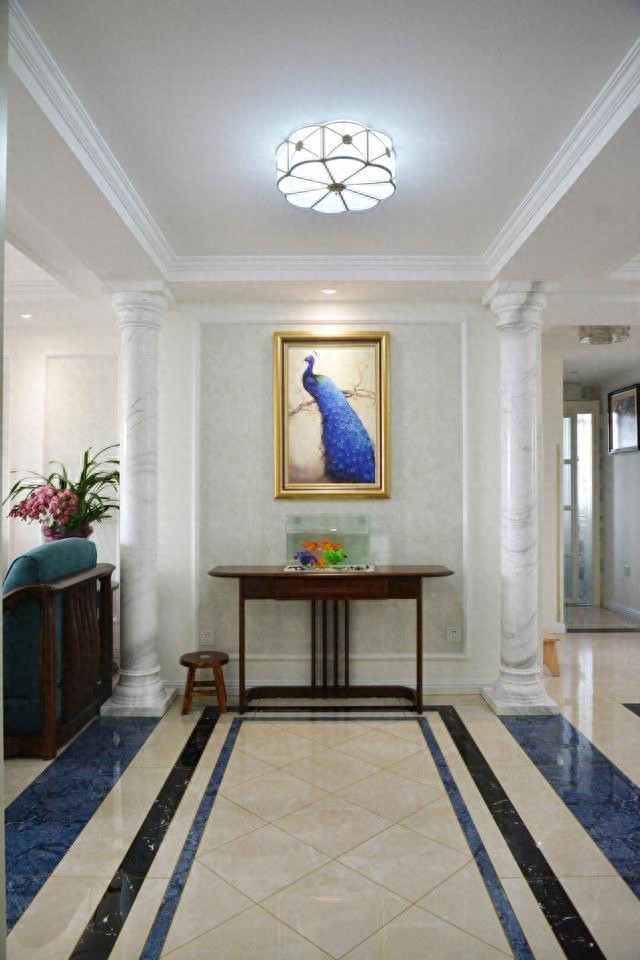 入户的玄关空间是一个过道,玄关背景墙是做了装饰,瓷砖上墙的设计更为好看,大气,背景墙的装饰画是一幅孔雀装饰画,看起来会更为奢华大气,一张实木的玄关柜作为装饰柜,很是好看,再摆上一个鱼缸,入户进来看到这样的装饰确实让人喜欢。