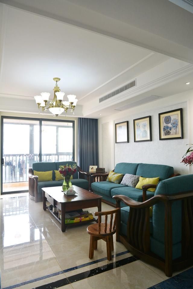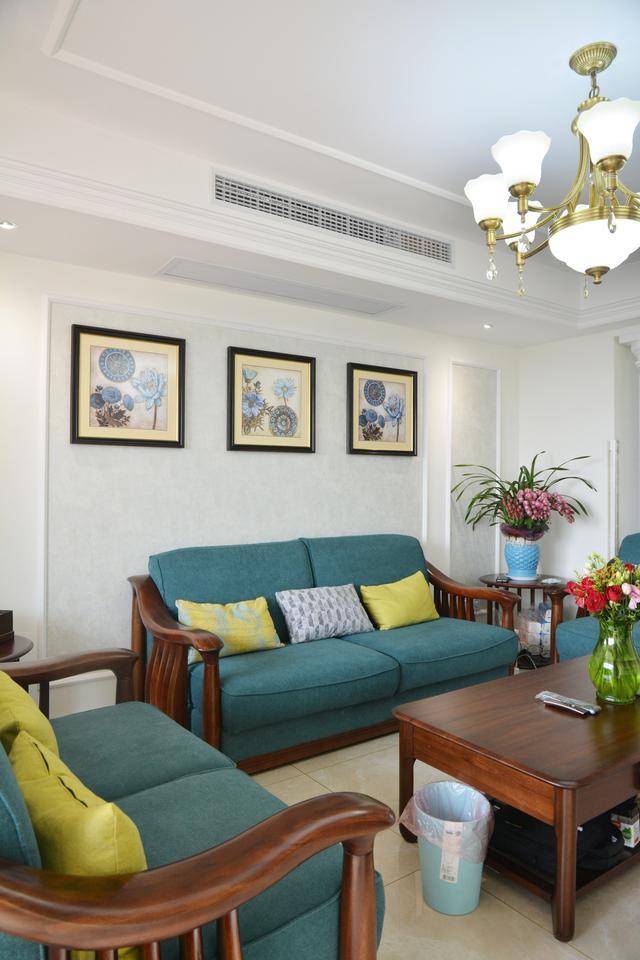 玄关的左手边就是客厅,整个客厅的区域宽敞舒适,简简单单的硬装,再搭配上家具的装饰,整个空间上更为舒适,比如实木的沙发以及茶几等,整套的搭配很是好看和大气,背景墙则是装饰画作为背景装饰。