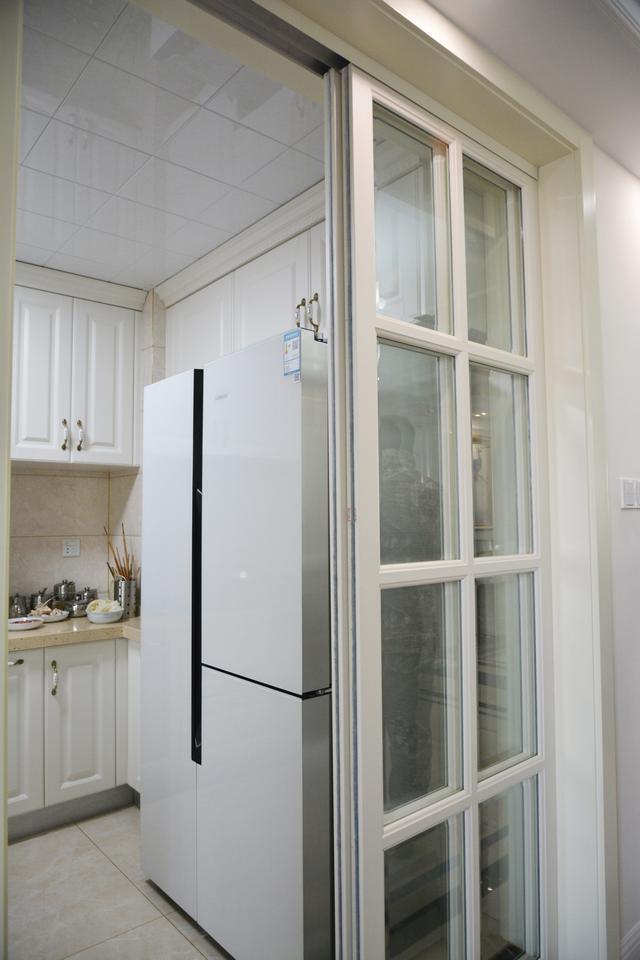 厨房,做了推拉门的隔断设计,充分利用了门后的空间放上冰箱,而厨房内部的空间宽敞,能够满足日常的生活需求,而且定制的柜子也超实用,颜值高,质量超好。现在很多厨房都是选这种材料,如果还是做铝合板的那种,很容易就坏掉了。