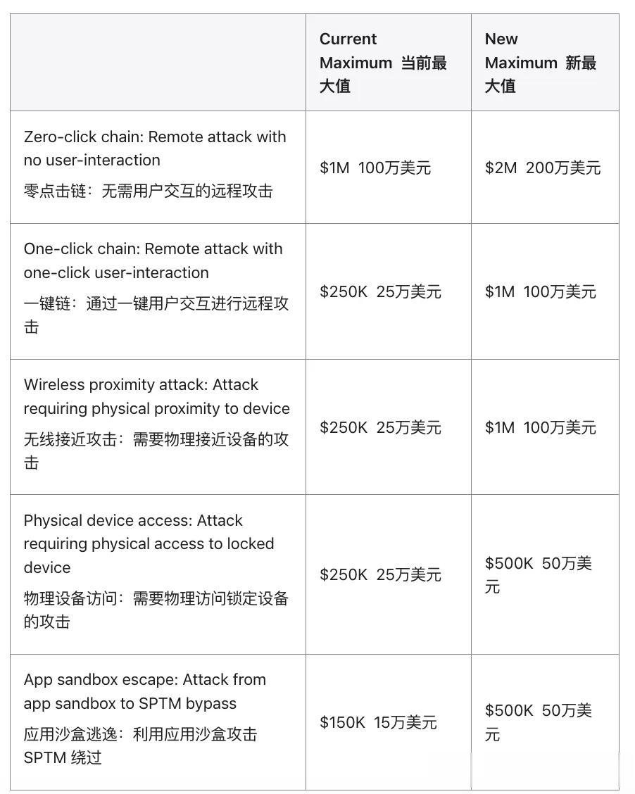 不仅如此,苹果还在基础奖金上进一步加码,为发现绕过锁定模式和测试版软件的漏洞提供额外奖金,这使得最高金额将突破500万美元。