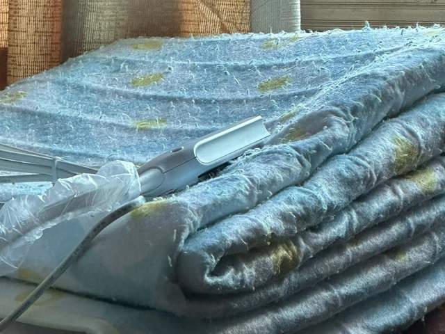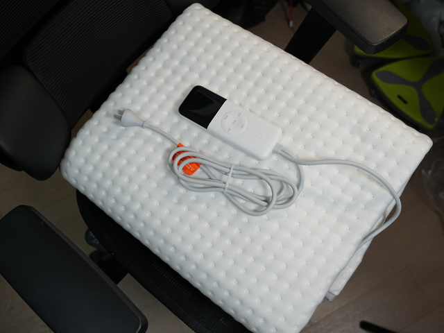 这块毯子是白色,摸上去非常柔软细腻,没有以前电热毯的毛刺生硬的感觉,摸上去也不是毛茸茸的手感,就像床单一样平整,各个裁剪处都一丝不苟。它的重量官方说是610g,我也没在意,总之它折叠起来就和睡觉的枕头差不多大,重量也确实很轻。