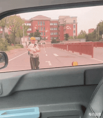 果然,不一会儿,就看到儿子抱着萨摩耶、背着大橘猫,一脸无辜地从校门口走出来。