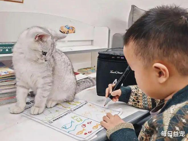 还有捡回来的流浪猫,居然自动担任起“作业监督员”,一看到孩子走神就一爪提醒~