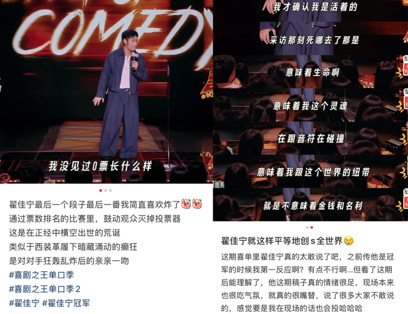 翟佳宁这样的表演,也让很多网友解锁了不一样的单口喜剧舞台。有网友表示,翟佳宁真的太敢说了吧,之前网传他是冠军的时候第一反应是有点震惊,但看总决赛后能理解了,直言如果自己在现场的话也会投这一票。不管是面对节目组还是气氛组,他都无所畏惧,只想说出心里的真实想法,并且每一句都那么好笑,感觉快把屋顶炸翻了,此刻“冒犯”已成艺术。