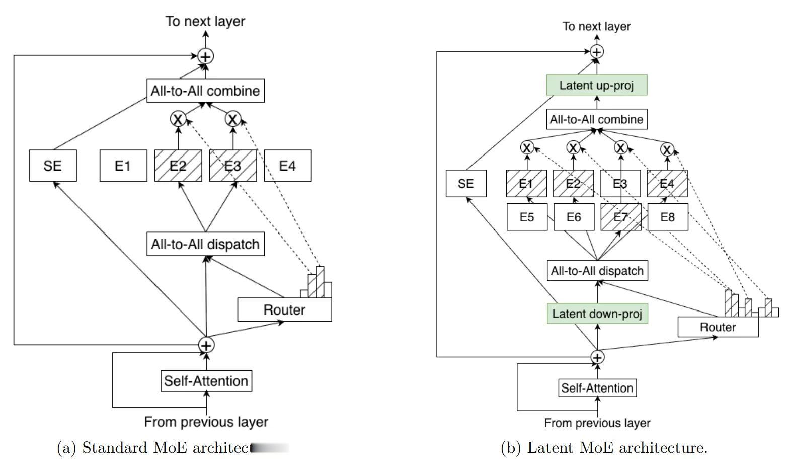 Nemotron 3 Super 和 Ultra 采用了潜在MoE技术。在此设计中,模型的各个“专家”模块并非直接处理原始的Token数据,而是先在一个共享的、维度更低的潜在表征空间 中进行运算,再将结果转换回Token空间。