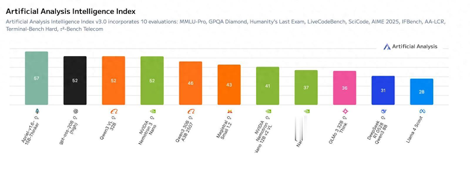 在Artificial Analysis Intelligence Index v3.0基准测试中,Nemotron 3 Nano在同等规模的模型中取得了领先的准确率得分(52分)。