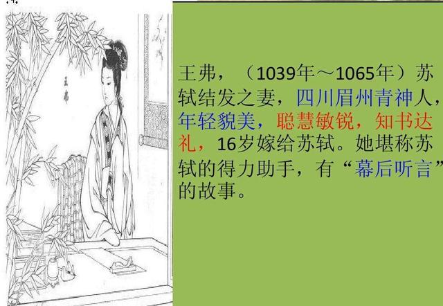王弗(1039年—1065年)是进士之女,她聪明贤惠、谦恭谨慎、知书达理,十六岁时嫁给了十九岁的苏轼。在有这位贤内助红袖添香的日子里,苏轼受益匪浅,他的仕途和生活都是一路顺风顺水。