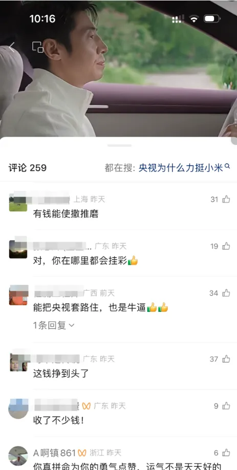 小柴随后去搜了下关键词,发现不少小米门店和博主都发了撒贝宁这段视频,而评论区无一例外都是这种画风,有些账号平时只有几条评论的,在这条视频下方,评论直接被干到几千条。那么这条视频到底是怎么拍的呢,是小米的广告吗?或者还是撒贝宁代言了小米汽车?小柴随后去查了下,这是央视发布的一则轮胎厂商的视频,表达的是中国汽车产业成熟的产业链,只不过用了小米YU7的车,撒贝宁也同时出镜了。