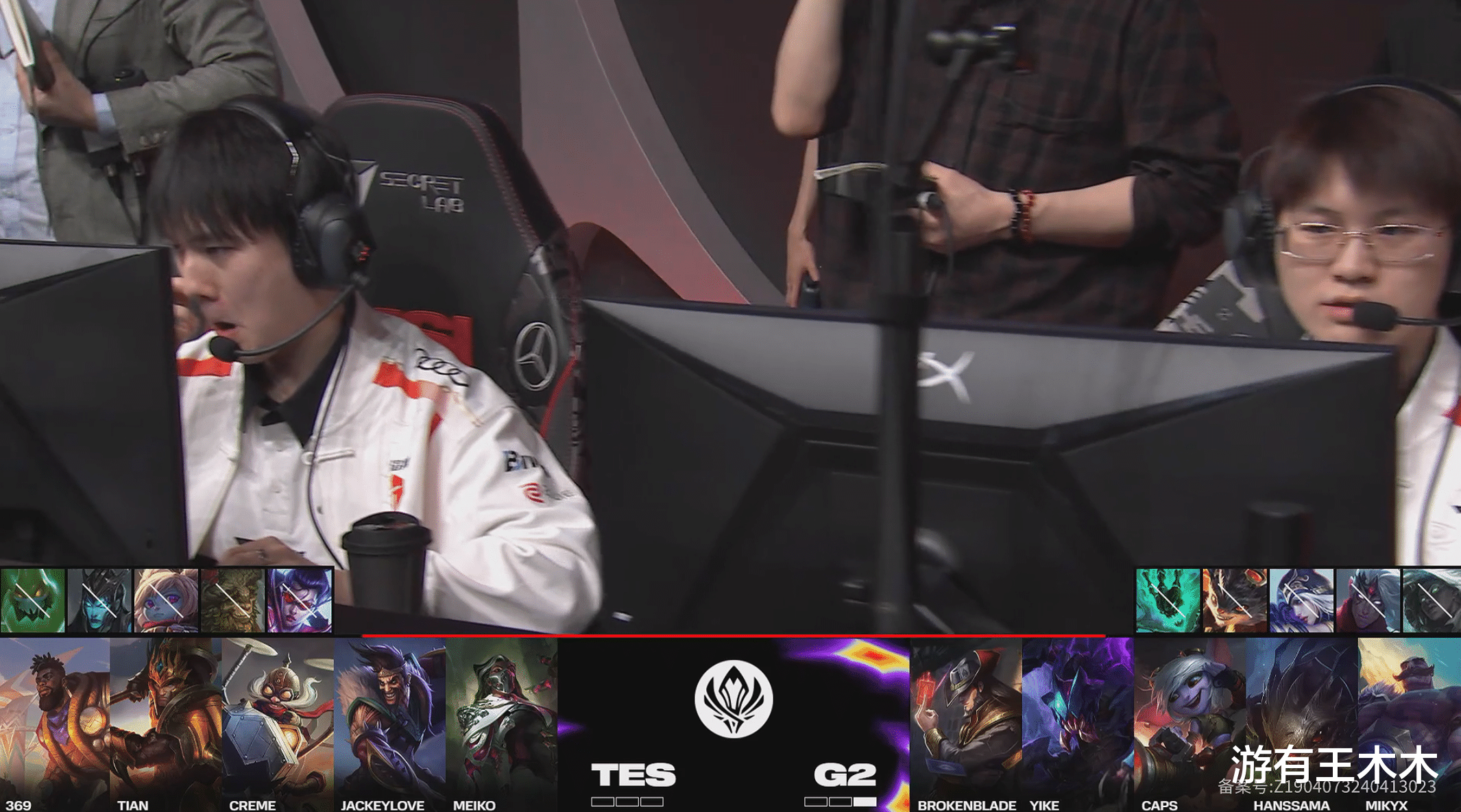 TES战队选用奎桑提、皇子、飞机、德莱文、烈娜塔;G2战队选用卡牌、雷克赛、小炮、大嘴、布隆。
