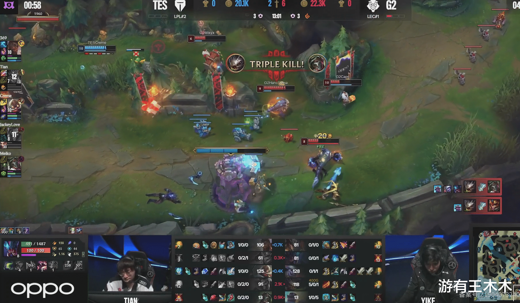 13分钟G2战队想来越塔,TES皇子已经赶过来帮忙了。奈何G2大嘴伤害实在太爆,德莱文反打失败直接被秒,G2小炮也是提前支援,TES战队再次送出三个人头。好在TES上单奎桑提对线优势很大,皇子也帮他抓了两次,把G2卡牌打成废人,局面暂时还是稳住了。