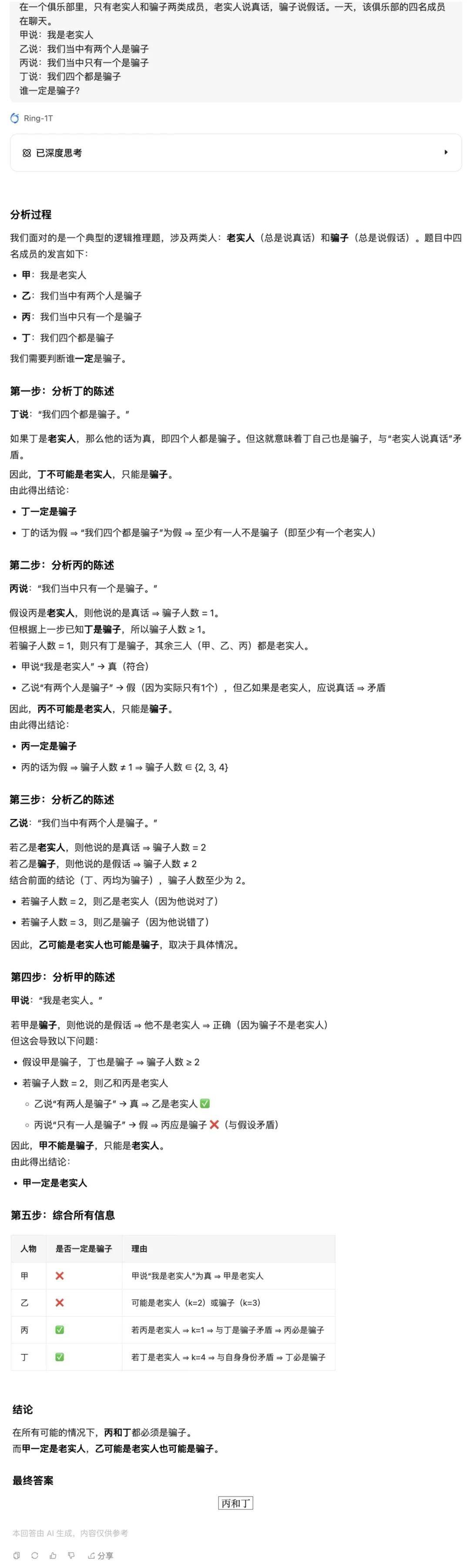 提示词:在一个俱乐部里,只有老实人骗子两类成员,老实人说真话,骗子说假话。一天,该俱乐部的四名成员在聊天。