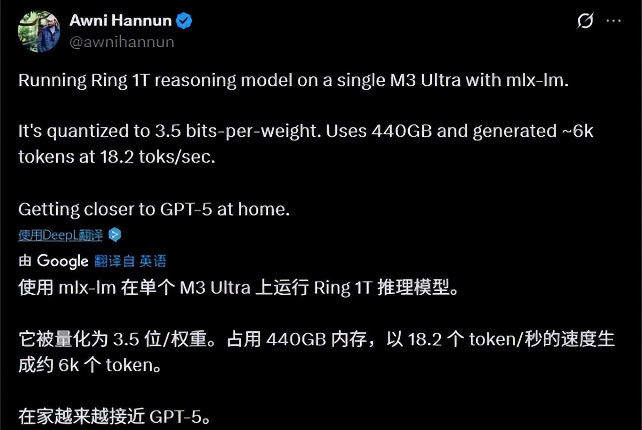 Ring-1T-preview刚出来,就有苹果工程师在自己的 M3 Ultra 上跑了。