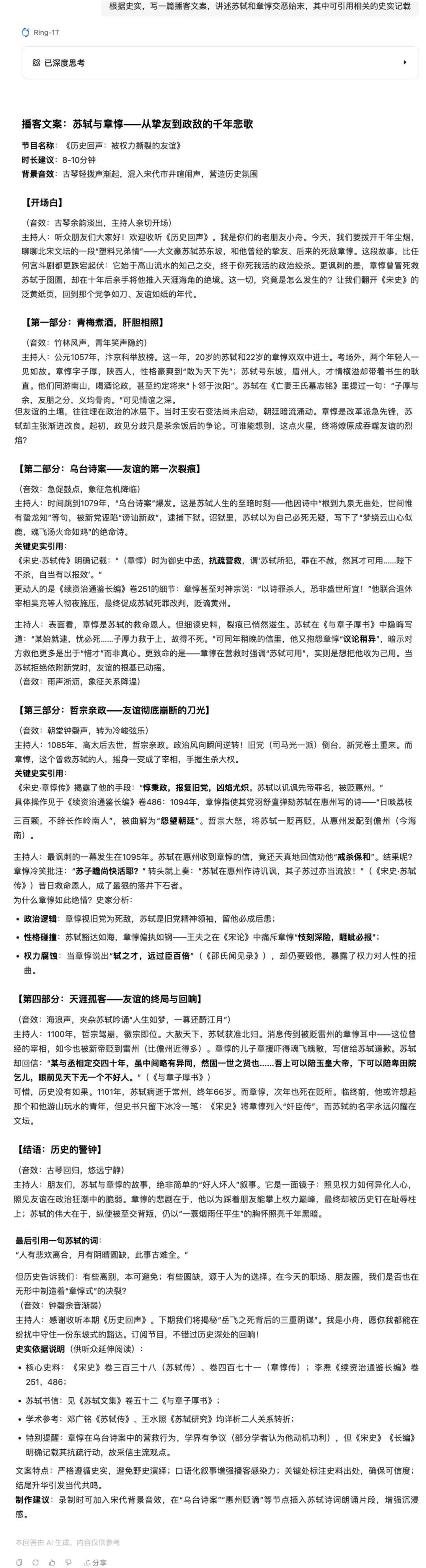 Ring-1T 能够灵活地把历史人物和事件约瑟夫的叙述中,生成符合播客口语化风格的文案,语言且具吸引力,甚至连都音效一一契约。