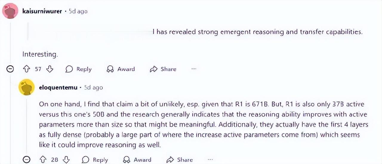 reddit上也有讨论。有分析认为,蚂蚁的设计确实有让推理变强的合理机制,比如主动参数更多、前几层全密集。