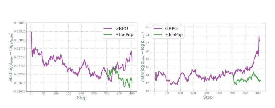 标准GRPO在短程还能稳定住,但训练百步后很快「高烧」,奖励信号失真,梯度暴冲,训练直接翻车。图1:GRPO训练推差随着训练指数上升,Icepop处于平稳;图2:训练推差上升,GRPO随着训练上升非常明显,Icepop维持在较低水位。