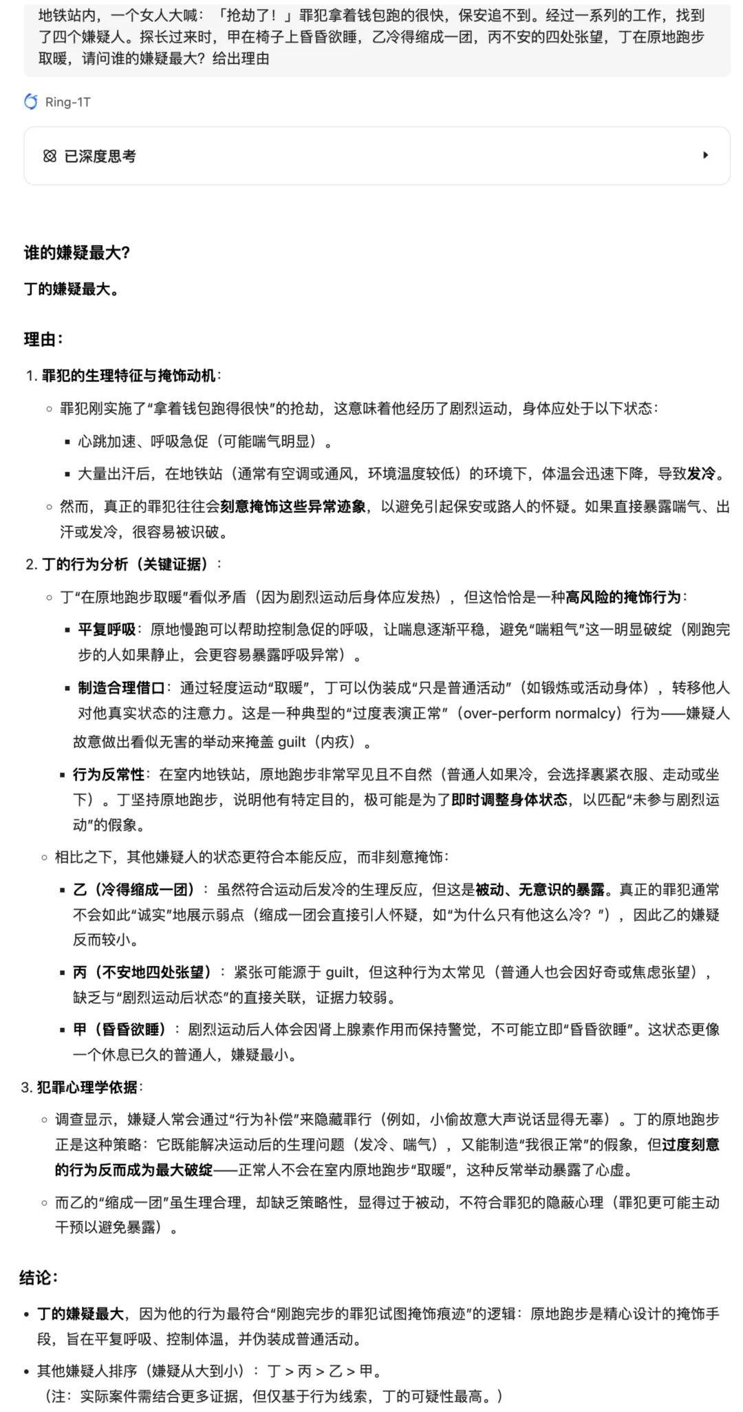Ring-1T准确识别出不同嫌疑人的行为与威胁,并经过一系列推理,最终给出了正确的答案。这种推理不仅依赖于对威胁的理解,还考虑到了行为模式和心理状态的微妙差异。
