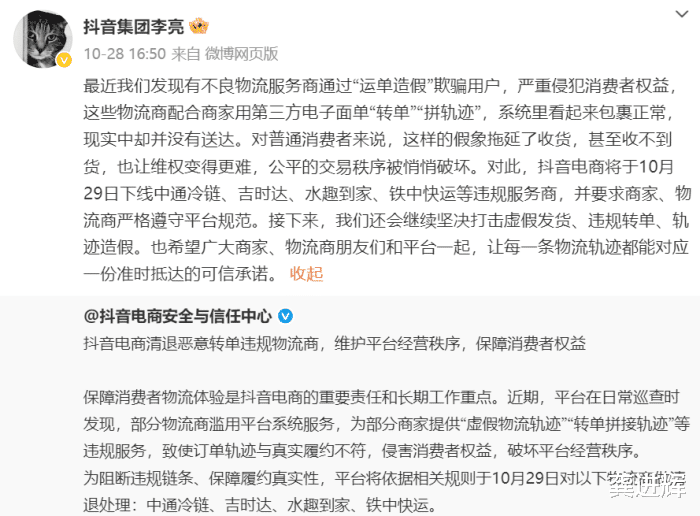 第二件是子公司被抖音电商清退。近期,抖音电商安全与信任中心发文宣布清退恶意转单违规物流商,中通子公司中通冷链在被清退之列。“为阻断违规链条、保障履约真实性,抖音平台将依据相关规则于10月29日对中通冷链、吉时达、水趣到家、铁中快运等物流商做清退处理。”